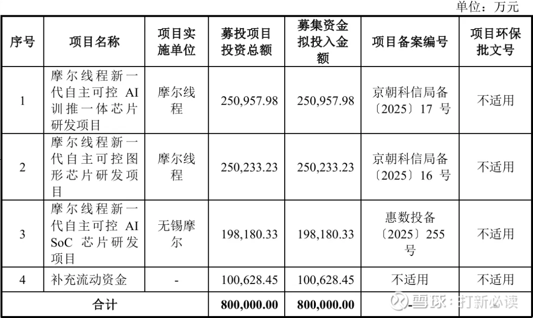 本此拟募资用途:项目总投资资金80亿,其中25.1亿用于摩尔线程新一代自主可控A训推一体芯片研发项目,25.02亿用于摩尔线程新一代自主可控图形芯片研发项目,19.82亿用于摩尔线程新一代自主可控AISoC芯片研发项目,10.06亿用于补充流动资金,具体项目如下: