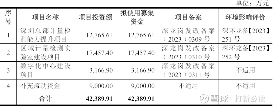 本此拟募资用途:项目总投资资金4.24亿,其中1.28亿用于深圳总部计量检测能力提升项目 ,1.75亿用于区域计量检测实 验室建设项目,0.32亿用于数字化中心建设 项目,0.9亿用于补充流动性资金,具体项目如下: