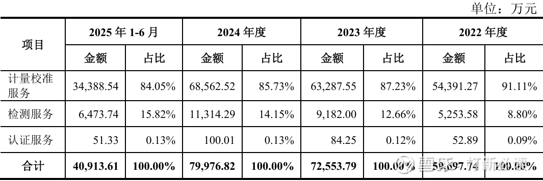 2025H1,公司主营业务收入按业务类别可分为三大板块,分别为计量校准服务(3.44亿元,占 2025H1 主营收入的84.05%)、检测服务(0.65 亿元,占 2025H1 主营收入的 15.82%)、认证服务(51.33万元,占2025H1主营收入的0.13%);2022年至2025H1,计量校准服务始终为公司的主要收入来源、收入占比稳定在 80%以上;同时检测服务的收入占比逐年抬升,由 2022年的 8.80%增至 2025H1的15.82%。
