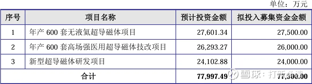 本此拟募资用途:项目总投资资金7.75亿,其中2.75亿用于年产600套无液氦超导磁体项目,2.6亿用于年产600套高场强医用超导磁体技改项目,2.4亿用于新型超导磁体研发项目,具体项目如下: