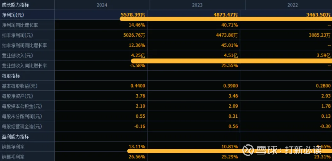 公司 2022-2024年分别实现营业收入3.59万元/4.51亿元/4.25亿元,增长率依次为-%/25.55%/-5.58%;实现归母净利润0.35亿元/0.49亿元/0.56亿元,增长率依次为-%/40.71%/14.46%。