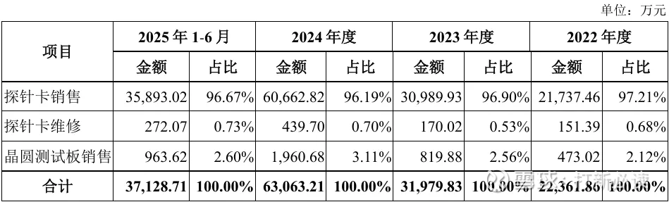 2025H1,公司主营业务收入按业务类别可分为三大板块,分别为探针卡销售(3.59亿元,占2025H1 主营收入的 96.67%)、探针卡维修(0.03 亿元,占 2025H1 主营收入的 0.73%)、晶圆测试板销售(0.10 亿元,占 2025H1 主营收入的 2.60%)。2022年至 2025H1,公司始终以探针卡销售为主要业务,收入占比稳定在 95%以上;而在探针卡销售方面,公司拥有2D12.5DMEMS探针卡、垂直探针卡、悬臂探针卡、薄膜探针卡等,目前以 2D/2.5DMEMS 探针卡为主要产品2025H1占探针卡销售收入的88%。