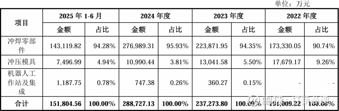 2025H1,公司主营业务收入按产品类别可分为三大板块,分别为冲焊零部件(14.31亿元,占 2025H1 主营收入的 94.28%)、冲压模具(0.75 亿元,占 2025H1 主营收入的 4.94%)、机器人工作站及集成(0.12亿元,占2025H1主营收入的0.78%)。2022年至2025H1,冲焊零部件始终为公司的核心产品及主要收入来源,其收入占比稳定在 90%以上、且整体呈增长态势。
