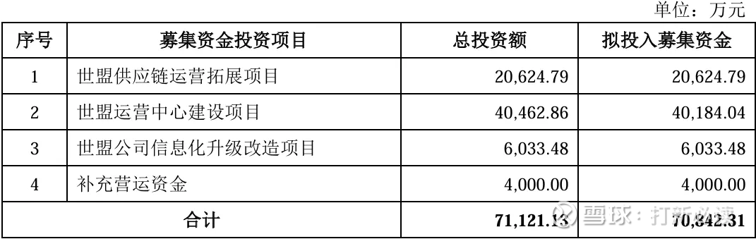 本此拟募资用途:项目总投资资金7.08亿,其中2.06亿用于世盟供应链运营拓展项目,4.02亿用于世盟运营中心建设项目,0.6亿用于世盟公司信息化升级改造项目,0.4亿用于补充营运资金,具体项目如下: