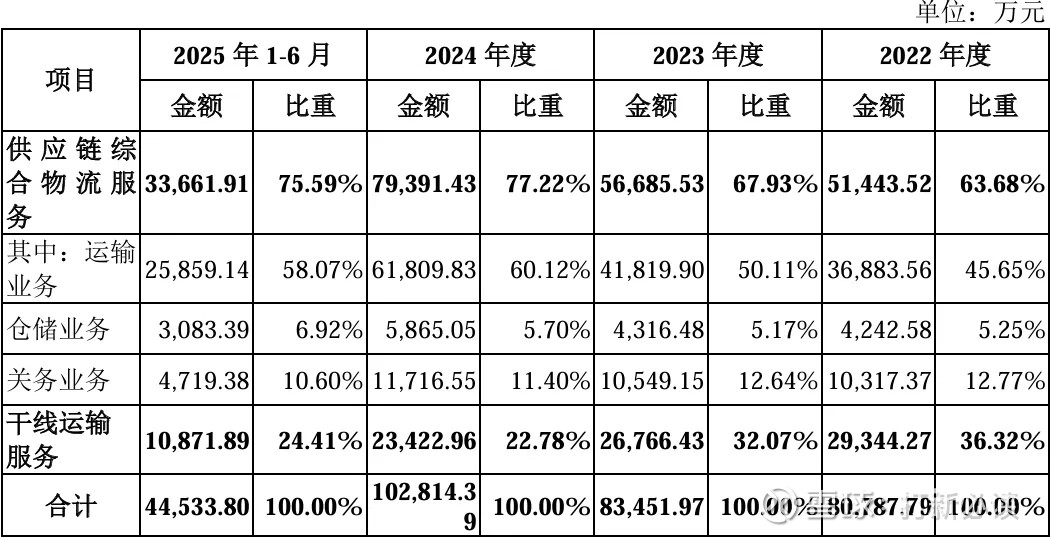 2025H1,公司主营业务收入按业务类别可分为两大板块,分别为供应链综合物流服务(3.37亿元,占2025H1主营收入的75.59%)、干线运输服务(1.09亿元,占2025H1主营收入的24.41%)。2022年至2025H1,供应链综合物流服务始终为公司的核心业务及主要收入来源,其收入占比稳定在60%以上;而在供应链综合物流服务业务中,又以运输业务为主体。