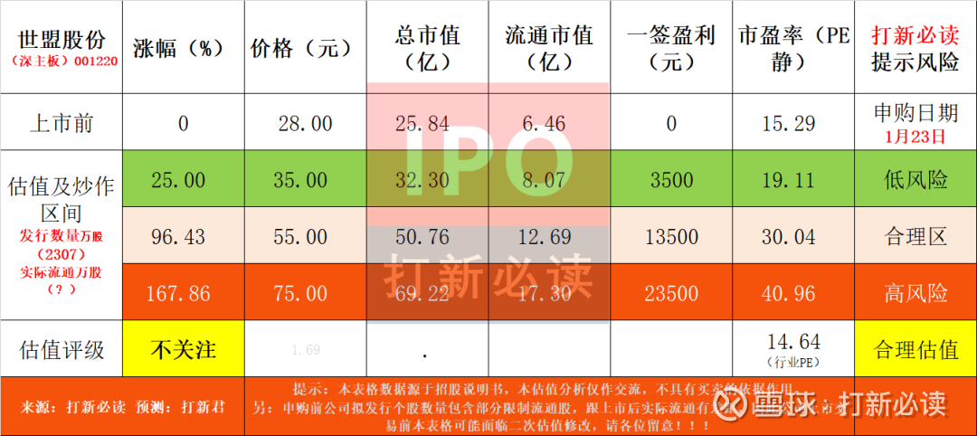 【提示说明】:本表格数据源于招股说明书,申购前公司拟发行个股数量包含部分限制流通股,跟上市后实际流通有差距,因此公司上市交易前本表格可能面临二次估值修改,请各位留意!!!$世盟股份(SZ001220)$