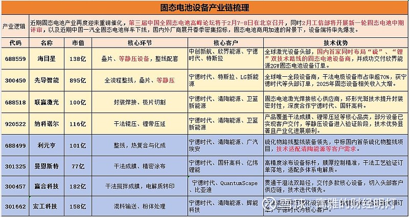 近期固态电池产业再度迎来重磅催化,第三届中国全固态电池高峰论坛将于2月7-8日在北京召开,同时2月工信部将开展新一轮固态电池中期评审,以及近期中国一汽全固态电池样车下线,国内外厂商展开春季密集招标,固态电池商用加速的背景下,设备端将率先爆发。