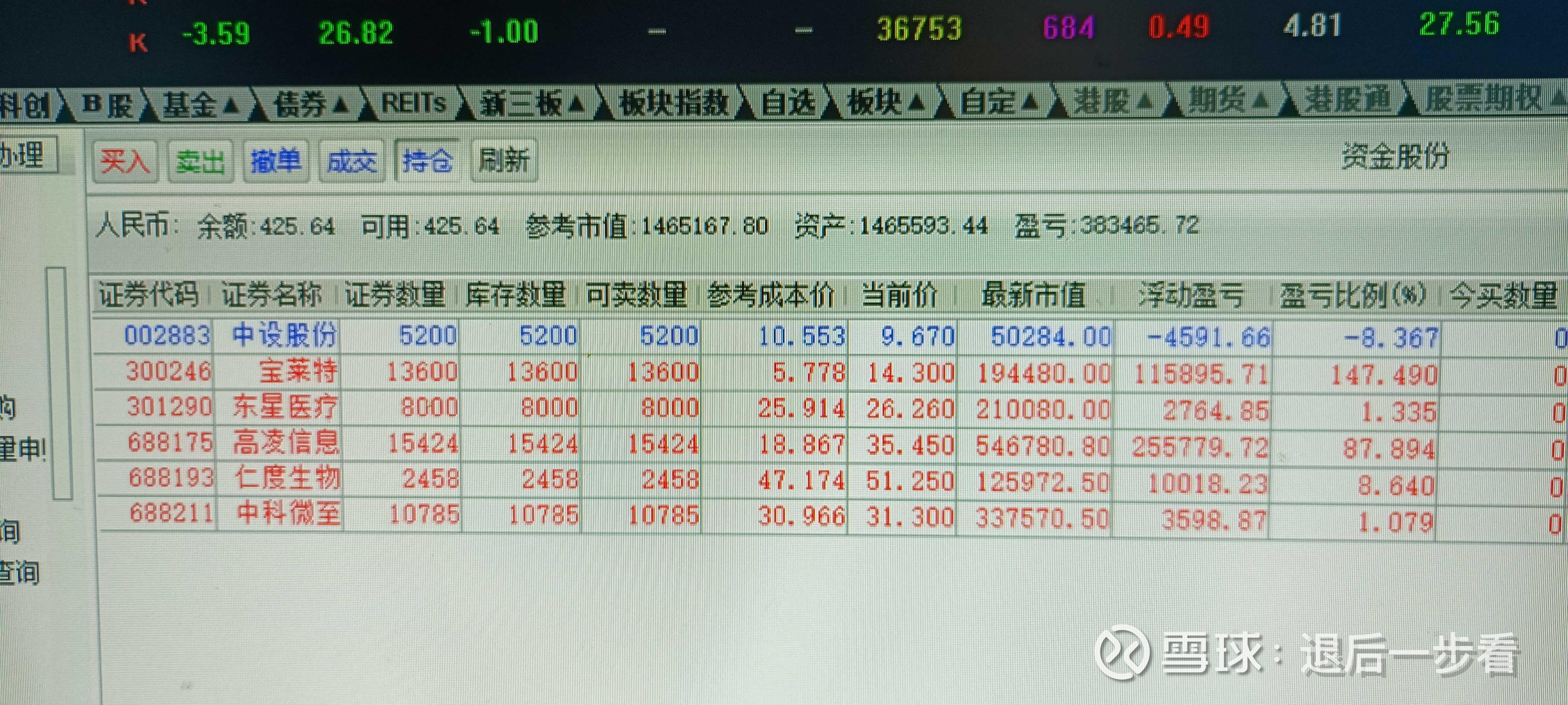 原始投入资金是328856元,上月初转入了10万短期资金,转入当天就买入了中设股份和中科微至,现在这两笔交易均被套,中设股份套8.3%,中科微至套3.3%,但我一点都不担心,两个股票都还在底部,等一段时间肯定会盈利的。