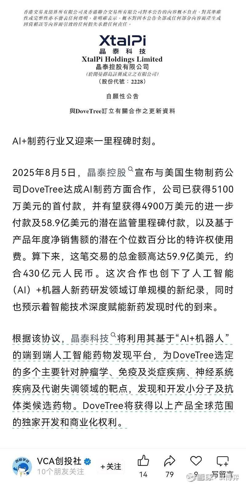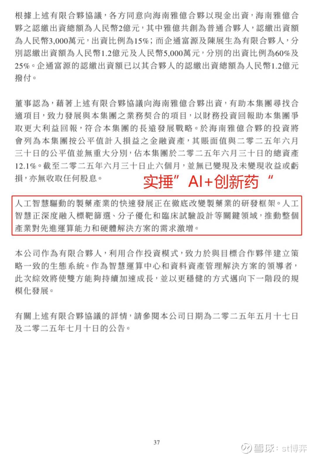 也有观点认为,公司转型“Al+创新药”(这个观点在企展控股2025年半年度报告第37页得到了有效验证:“人工智慧驅動的製藥產業的快速發展正在徹底改變製蔡業的研發框架。人工智慧正深度融入標靶篩選、分子優化和臨床試驗設計等關鍵領域,推動整產業對先進運算能力和硬體解决方案的需求激增。”),