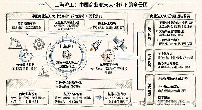 上海沪工在商业航天领域的价值在于其是火箭结构件(如壳体)的核心供应商,深度参与可回收火箭的制造配套,并将直接受益于商业航天发射需求的增长和火箭技术的突破,是商业航天产业链上游制造端的重要标的。$上海沪工(SH603131)$
