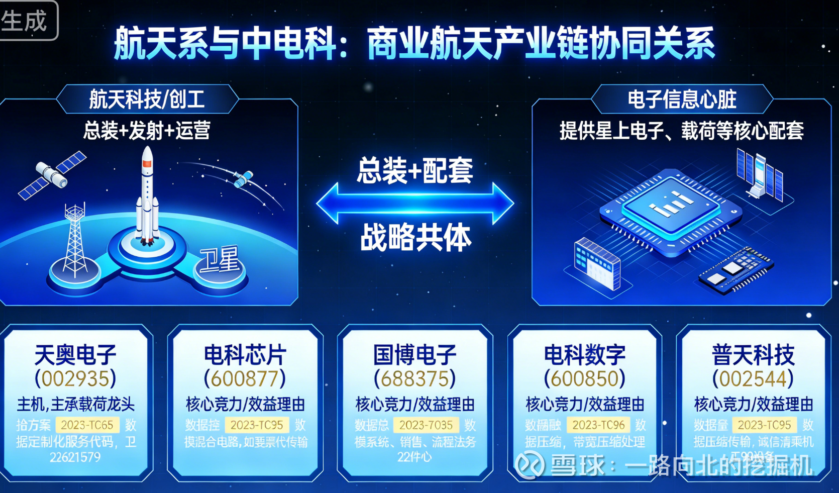 我用大白话把这事说透:商业航天里,航天系是“总装+火箭+运营”的系统集成商,中电科是“电子心脏+神经+安全盾”的核心供应商,两者是“整机+零件”的铁搭档,一起干“国家队商业航天”(星网/千帆等)的大项目 。