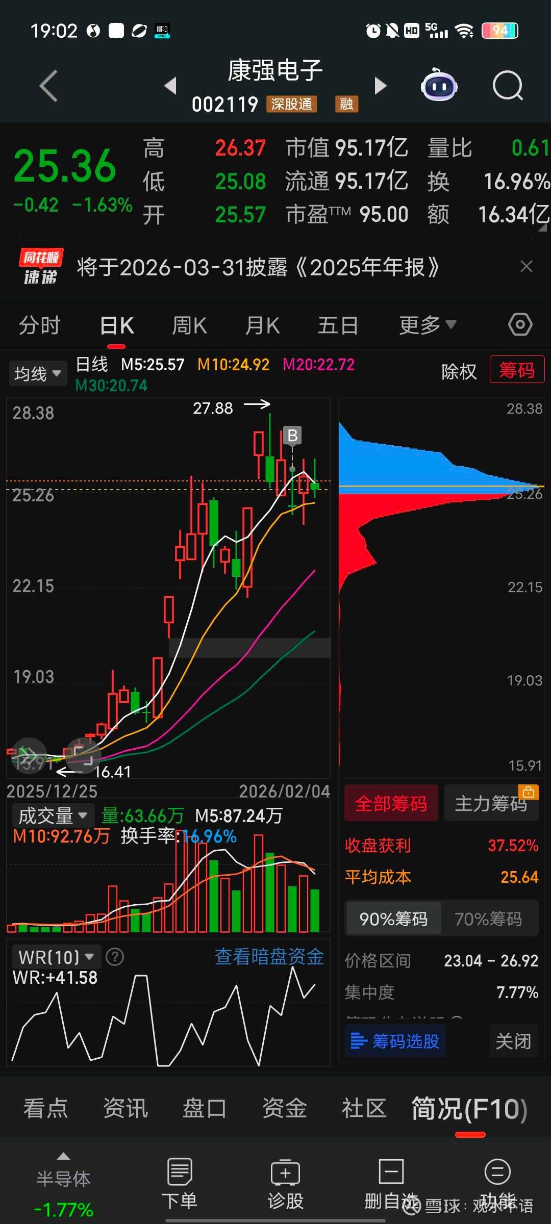 昨天上涨有明显量能增长,今天缩量下跌,还是在我的预期之内,然后止损线也没触碰到,今天25.2左右支撑线很强,证明主力还没有撤,后续还是很看好的,拿住就行,没有出现异常行为,反而回调量价表现的很健康,就看看今晚美股半导体和储存表现的怎么样吧,表现的好,明天就静等花开了!总之卖点没到就一股不卖,遵守交易纪律!纪律为王!避免频繁换股,追涨杀跌!