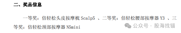 奖品信息:一等奖:倍轻松头皮按摩梳Scalp5、二等奖:倍轻松腰部按摩器Y3、三等奖:倍轻松颈部按摩器N5min。