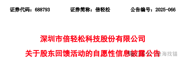 2025/9/23,倍轻松(688793)发布《关于股东回馈活动的自愿性信息披露公告》,主要信息如下:
