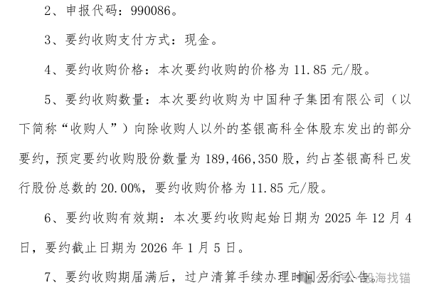 2、荃银高科(300087)发布《关于中国种子集团有限公司要约收购公司股份的申报公告》,预示着要约收购正式落地实施,本次要约收购起始日期为2025年12月4日,要约截止日期为2026年1月5日。
