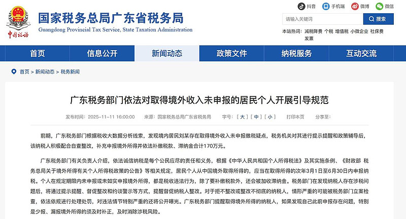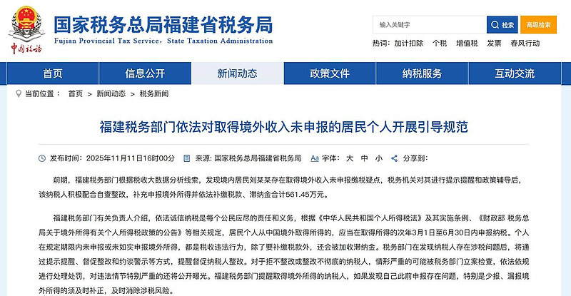 北京、广东、福建和四川税务部门陆续曝光了6起对取得境外收入未依法申报人员开展引导规范的典型案件,提醒纳税人自查整改,补缴税款。