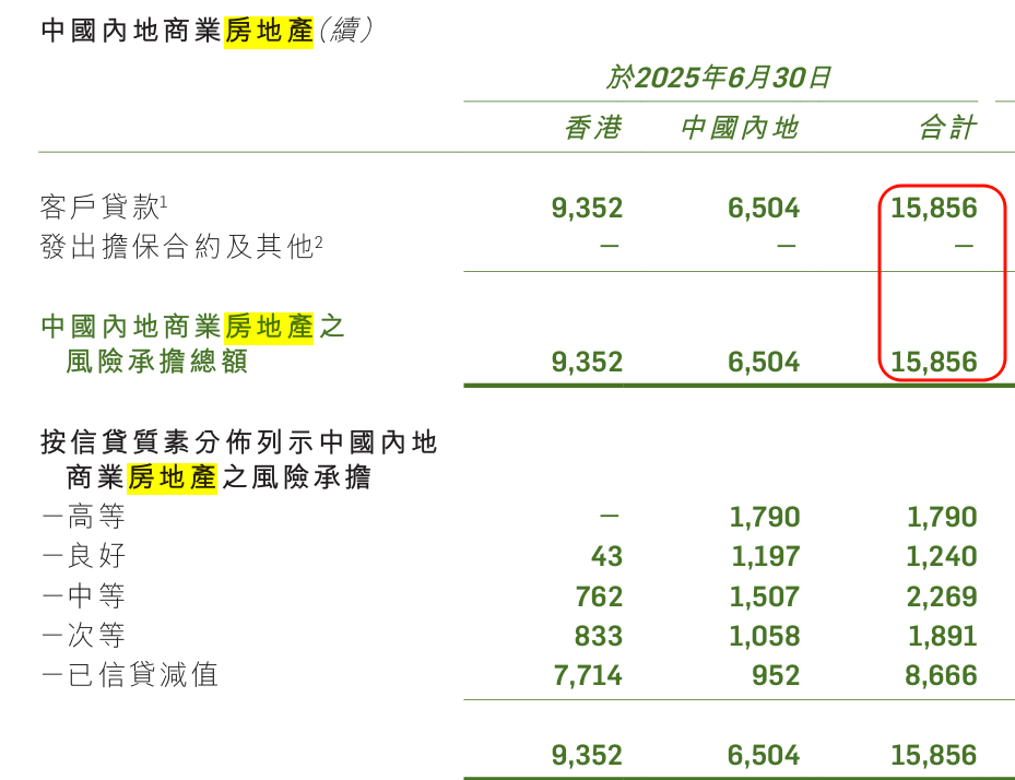 半年报显示,恒生银行对中国内地房产的贷款总额是158.56亿港元,其中超过一半的贷款(86.66亿元得)已经计提减值。