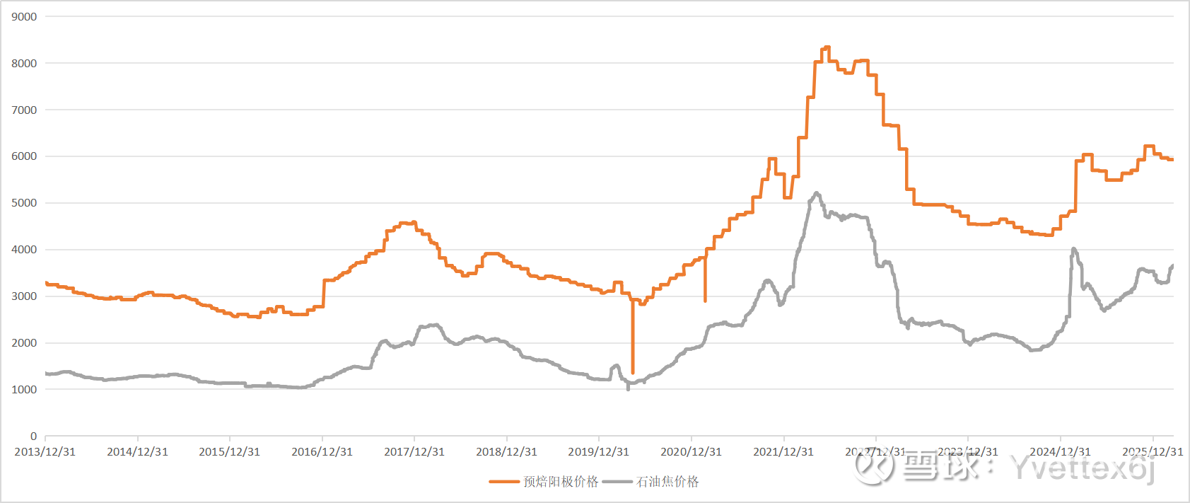 首先要确定石油焦-预焙阳极的顺价传导逻辑。月底又到了预焙阳极出下个月采购指导价的时候。今天中铝(上海)碳素官宣:2026年4月预焙阳极销售定价环比涨385元/吨,覆盖西北、华北、华南、西南四大区域。其中西北/华南/西南:5607元/吨,华北:5557元/吨。还有一个经常会看的是山东某大型铝厂预焙阳极采购基准价格,应该跟中铝的涨价幅度差不多。预焙阳极价格采用成本加成法,主要参考原材料(石油焦为主)平均价格制