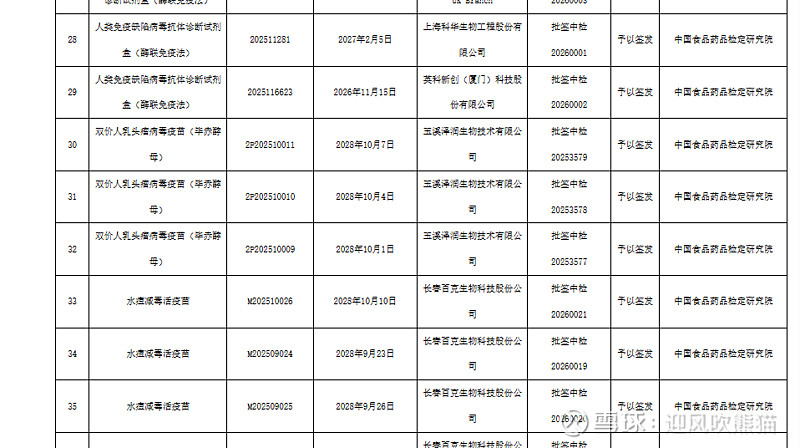 中检院生物制品批签发信息公示表(签发日期:2026年1月5日至2026年1月11日)