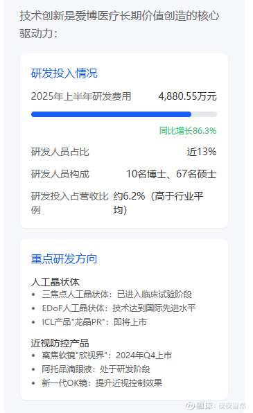 从整体看,爱博医疗的市场地位正在强化。公司在 2025 年上半年的市场份额变化显示:人工晶状体和 OK 镜市场份额稳中有升,隐形眼镜业务虽然基数小但增长迅速。随着产品结构优化和市场拓展,预计公司的综合市场地位将进一步提升。