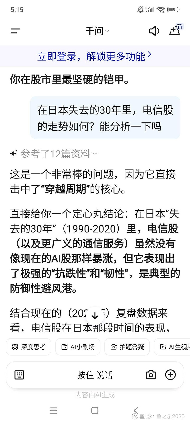我用人工智能问了日本失去的30年电信股的走势,结果非常稳健,现金奶牛,妥妥跑在前面。