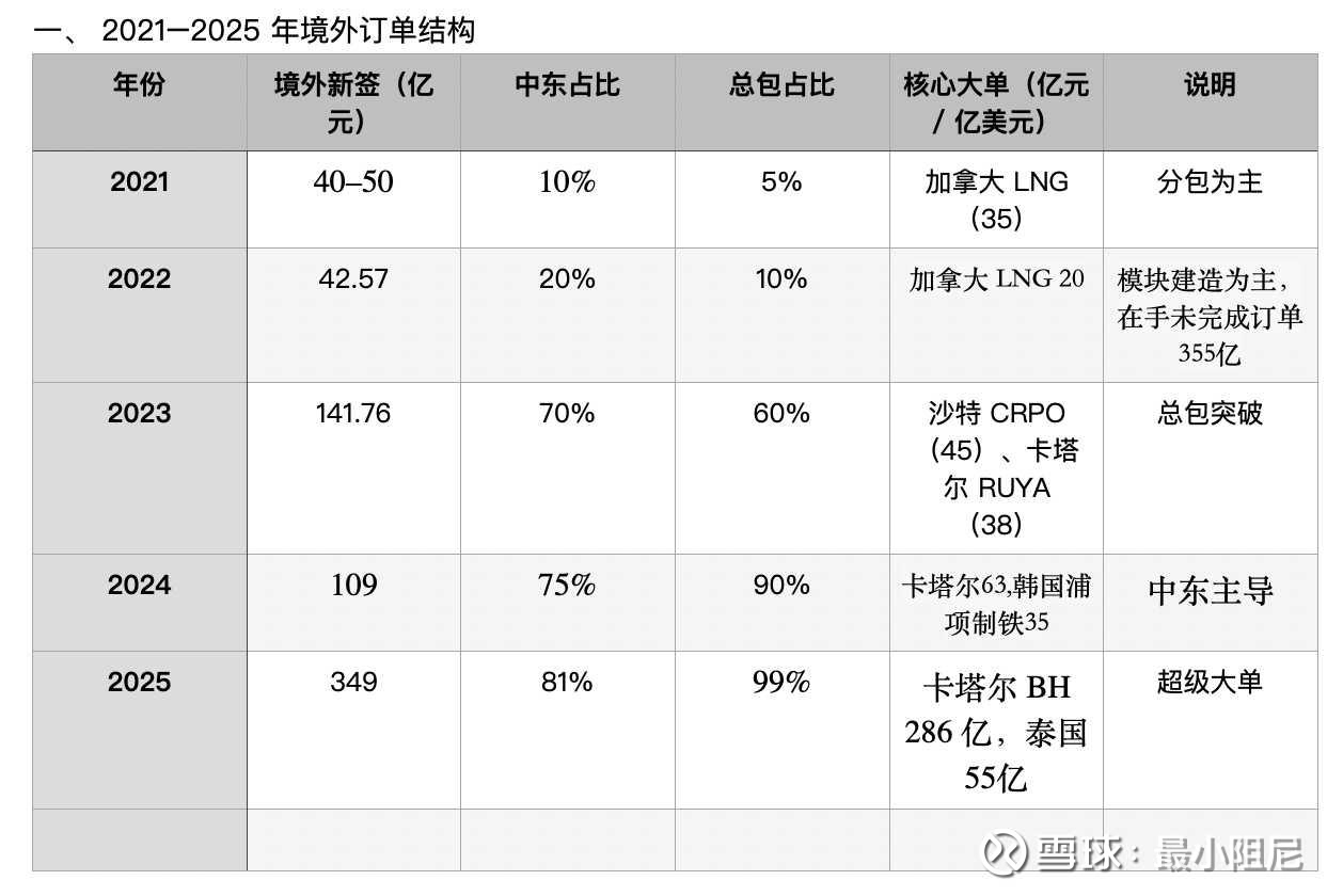 特征:分包为主、中东占比低、规模极小。 核心:这两年海外订单主要是加拿大 LNG 项目的模块建造分包。