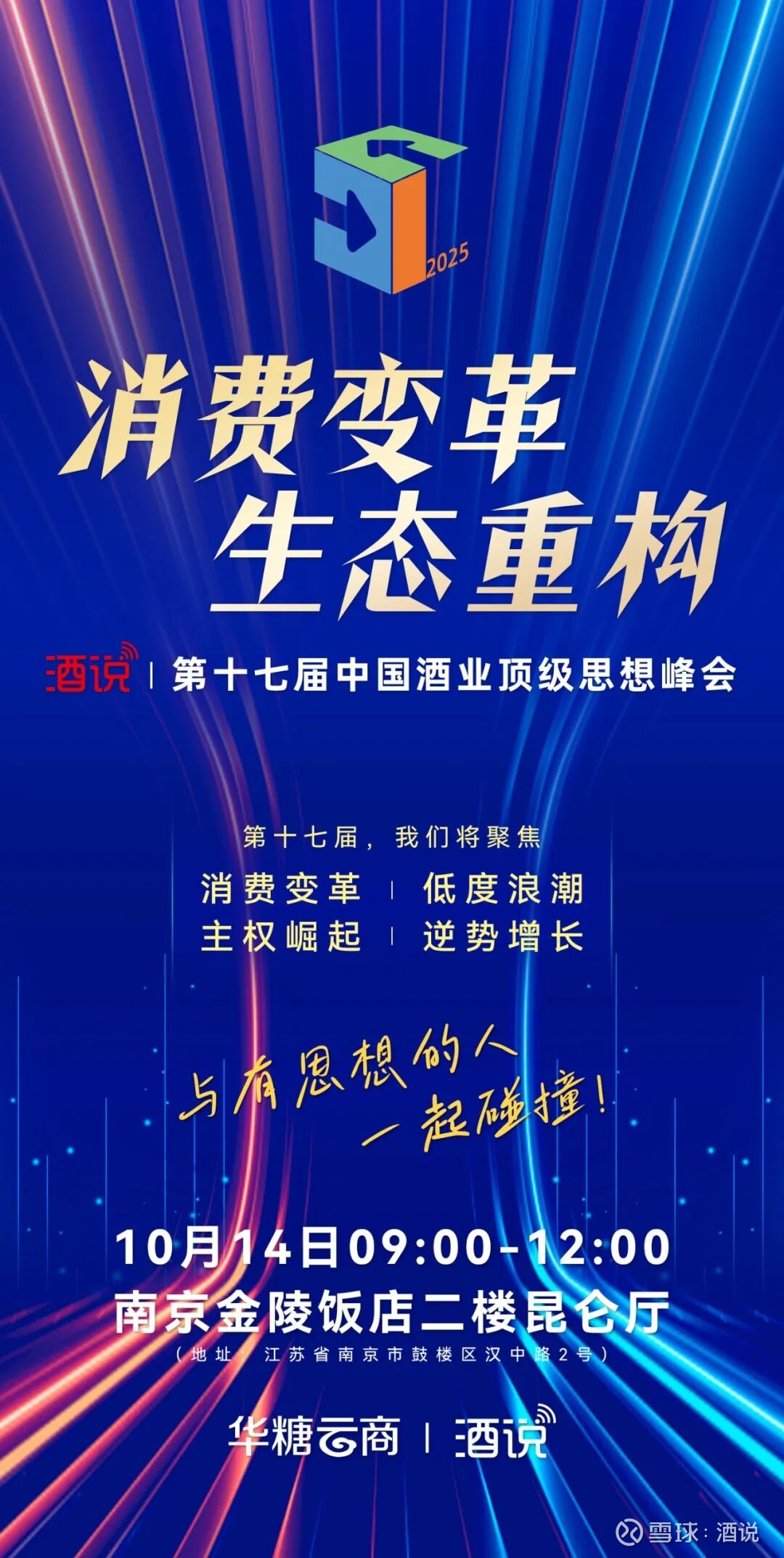 10月14日上午,以“消费变革 生态重构”为主题的酒说·第十七届中国酒业顶级思想峰会将在南京金陵饭店召开。本届峰会将聚焦“低度”“缩量增长”“消费变革”等热点议题,邀请实战专家、典范企业,进行庖丁解牛式的深度分享,不仅展示成果,更聚焦于背后的战略抉择、战术执行与核心能力构建,确保每一位参与者都能获得实实在在的“干货”与启发。