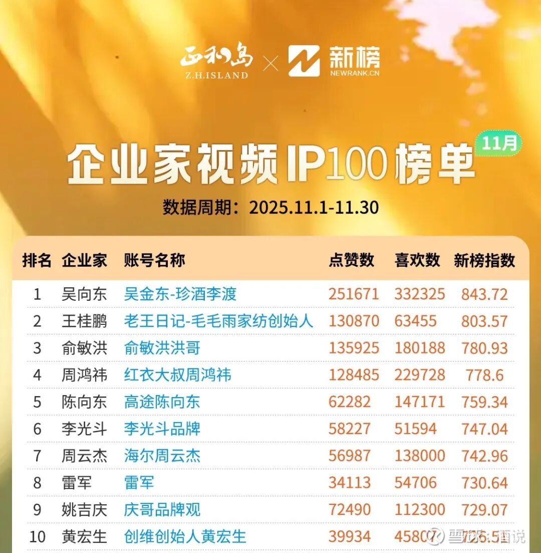 没有脚本、即兴表达,120多条视频收获3亿+传播量,单条视频最高播放量突破5100万,在正和岛联合新榜发布的《企业家视频IP100榜单(11月)》中,吴向东IP名列第一——这份成绩单的背后,是对内容价值的精准把握,不同于行业常见的“产品硬广”,吴向东的视频聚焦企业管理细节、行业思考、社会责任,用真实、接地气的内容,打破了企业家“高高在上”的刻板印象。