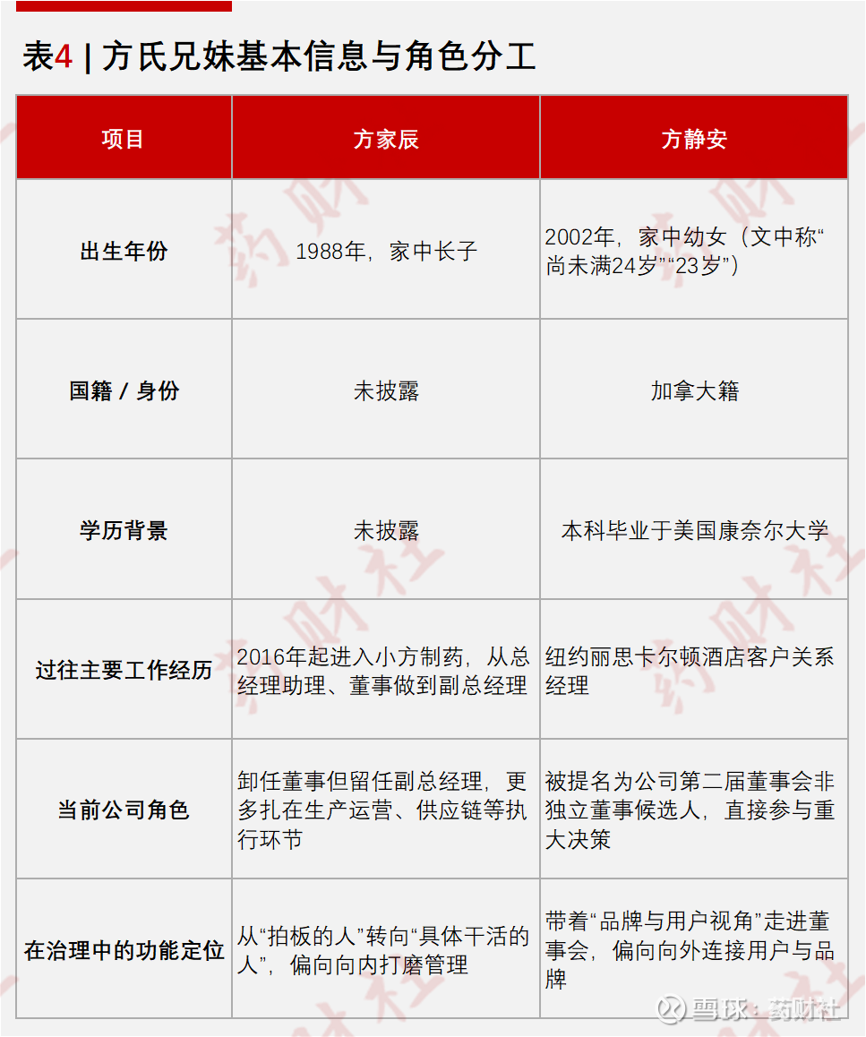 在小方制药这里,哥哥已经在企业内部深耕多年,妹妹则带着几乎完全不同的专业背景和国际化视角直接进入董事会,更像是把“产品经理+品牌主理人”的角色嵌入家族治理结构。