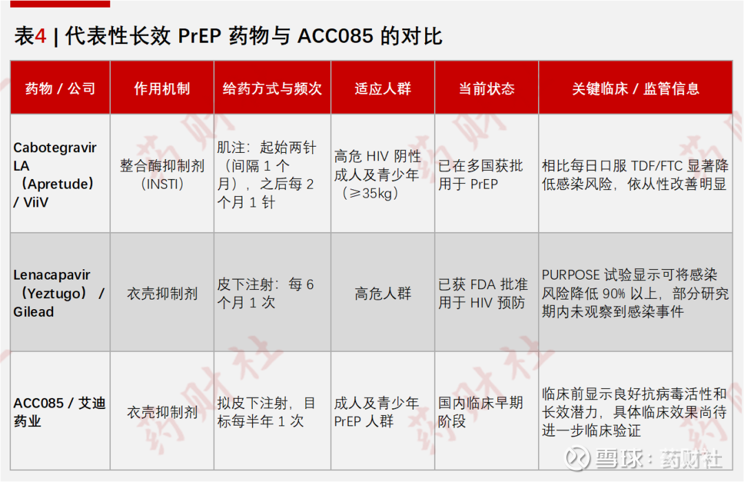 暴露前预防,也就是 PrEP(暴露前预防)方向,公司今年1月获批临床的 ACC085 注射液,指向的是另一种竞争逻辑:把预防从“天天记得吃药”,慢慢推向“更长周期打一针”。