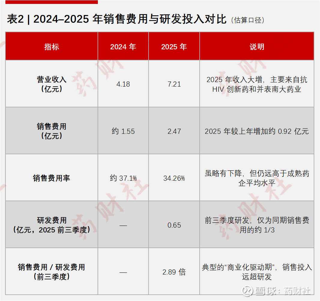 公司抗 HIV 创新药销售在放量,南大药业并表也带来了新增收入,经营性现金流到2025年前三季度甚至一度转正,看上去像是拐点将近;但另一边,销售费用全年冲到约2.47亿元,同比大增59.35%,占营收比重高达34.26%。
