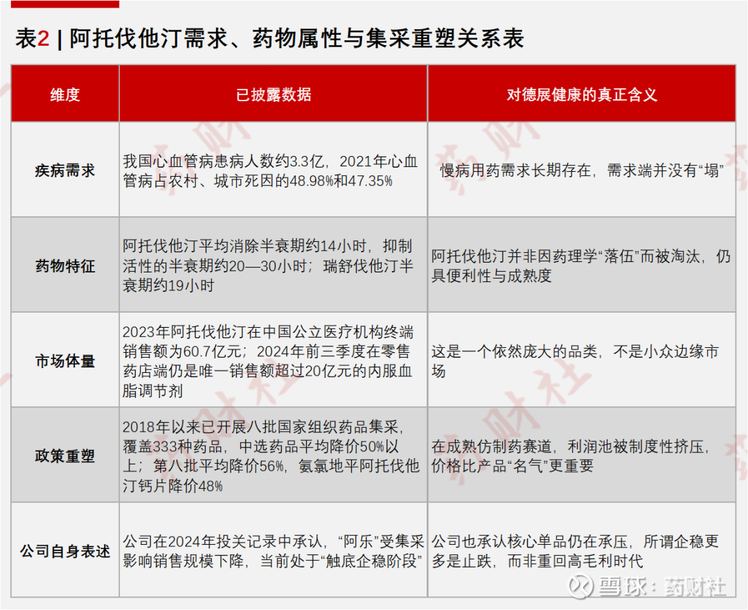 从医生和患者的日常体验看,阿托伐他汀在疗效、安全性、服用便利性与价格之间形成了相对均衡的选择,一度被视为降脂治疗的“国民药”,包括德展健康在内的多家药企靠它建立起庞大的销售网络。