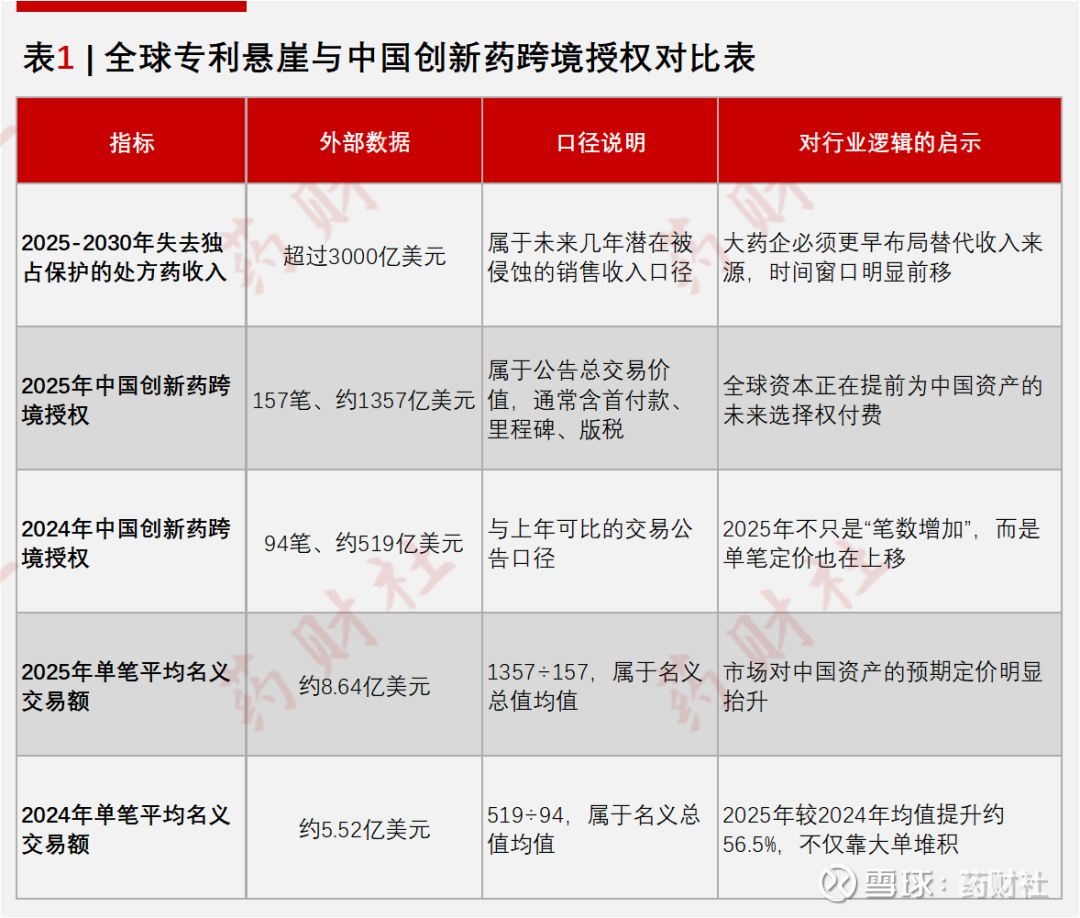 行业机构预计,2025年至2030年间,全球将有超过3000亿美元处方药收入失去独占保护;与此同时,按多家媒体援引数据,2025年中国创新药跨境授权交易总额约1357亿美元,交易数量达到157笔。
