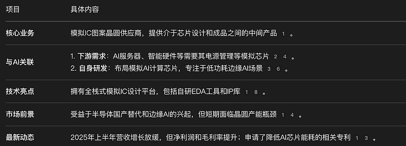 任何AI硬件(如服务器、智能眼镜、AI手机)的正常运行都离不开大量的模拟芯片,例如电源管理芯片、信号链芯片等。贝克微的核心价值在于,它通过图案晶圆模式,为下游的模组厂商和方案商提供了高效、低成本获取高质量模拟芯片的途径。这意味着,当AI应用带动整个半导体产业链需求增长时,贝克微这类位于产业链上游的基础元件供应商也会间接受益。作为“挑战者”:探索模拟AI新路径