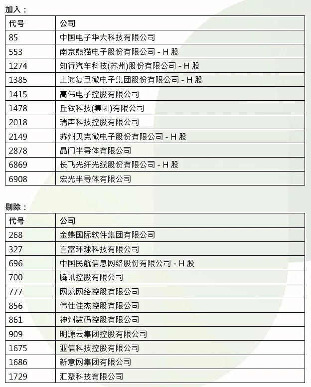 同时,指数剔除了23只股票,其中包括腾讯控股(00700.HK)等。