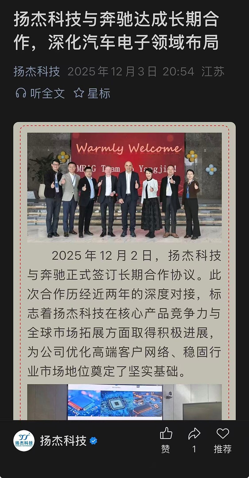 扬杰科技和奔驰达成长期合作。