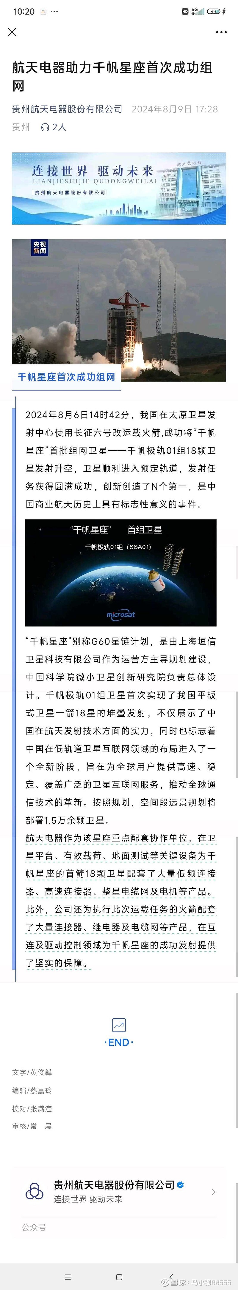 $航天电器(SZ002025)$ 航天电器助力千帆星座首次成功组网