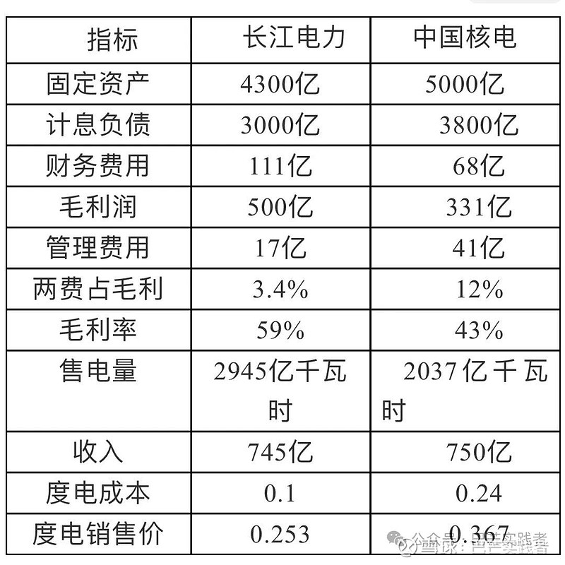 长江电力和中国核电都是属于高投入适当回报的生意,两家企业都有很高的有息负债,说白了都是靠借钱赚钱,高杠杆模式,长江电力的roe更高一些,不过中国核电的roe目前实际上是被扭曲了,会计只是纪录数字,而背后的真相需要投资者自己去思考,长江电力的费用更低,水力发电看起来更轻松简单,成本方面:长江电力的主要成本就是折旧,原材料是水,这个是免费的成本,而水是越大越好,你不用额外支付一分钱,中国核电除了折旧成本之外,他们还需要核原料铀,另外还有一些维修费,人工成本,所以中国核电的毛利率低于长江电力,长江电力的度电成本更有优势。售电方面,长江电力价格还是低于中国核电,这就相当于拥有一个强大的竞争优势,在目前电价现货市场化的情况下,长江电力的电价可能还有提升空间。折旧方面,长江电力的水电站可以用100年,折旧费用是不需要支出的,这就相当于他们拥有强大的现金流,每年折旧费用几百亿可以供公司支配,中国核电折旧一般是30—40年,实际上机组可以用到40—60年,也就是说还有10—20年利润释放空间,也还算不错,总体上长江电力是要远好于中国核电的,中国核电目前有一个优势,那就是拥有更大的扩张性,长江电力现在很难扩张大型水电站了,好了,简单对比到这里吧。