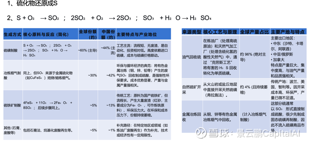 硫酸(H₂SO₄):最大来源是冶金烟气制酸(炼铜、炼锌)和石化行业磺化/烷基化装置。其产量取决于铜冶炼开工率和炼油厂原油加工量。