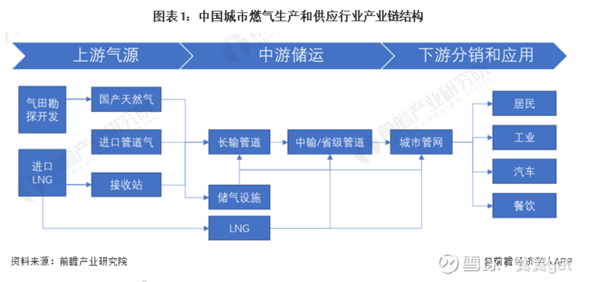 产业链:城市燃气生产和供应行业产业链主要是由上游气源的勘探开采、中游储存和输配送系统,以及下游分销系统组成。上游天然气气源主要是来自于气田,油气开采企业是城市燃气企业气源的主要供应商;中游的输配送系统可以分为长输管线或者液化天然气输配送系统;下游的城市分销系统就是城市燃气的核心运营模式。城市燃气运营商在通过市场竞争取得特许经营权之后,首先在城市中投资建设城市输配售系统,然后从长输或中输管道和门站取得天然气气源,再通过输配售系统将燃气输送至终端客户。
