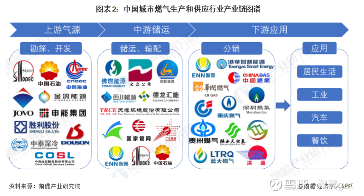 上游:中石油、中石化、中海油等国有大型石油企业+少数企业如申能股份依托自有天然气开采业务实现天然气勘探、开发