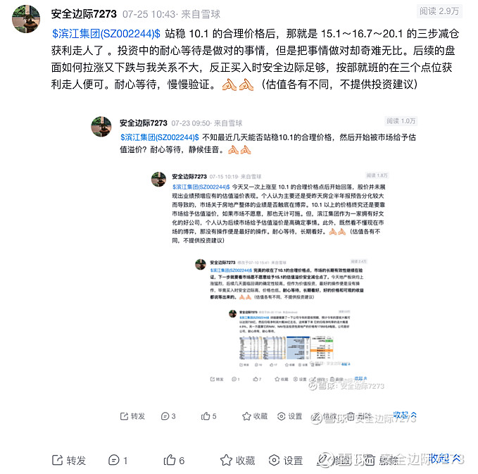 $滨江集团(SZ002244)$ 连续 4 个交易日的收盘价或开盘价均落在 10.1 的合理价格附近,现在房地产业的情况市场确实难以给予足够的估值溢价。但个人对后续头部房企还是有足够信心的,招商蛇口、越秀地产、滨江集团或许会输时间,但不会输钱是高确定性事情。耐心等待,慢慢验证。