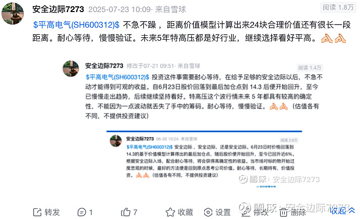 $平高电气(SH600312)$ 投资这事,主讲一个选好股后耐下心等待。平高电气距离 24 的合理价值已尽在咫尺,预计配合十五五的电网投资热度大概率不会花太久时间便能达到。希望平高电气能够成为 2026 年来首个实现价值回归的覆盖股。耐心等待,慢慢验证。(估值各有不同,不提供投资建议)