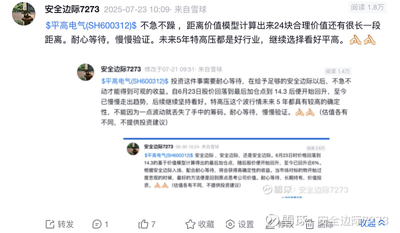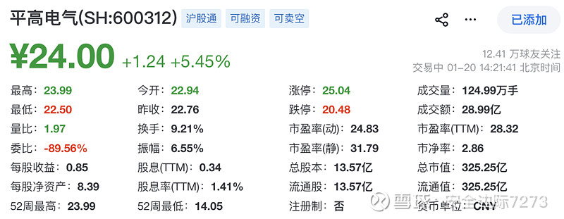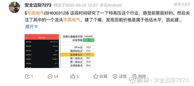 $平高电气(SH600312)$ 今天平高电气终到 24 的合理价格,属实不易。25 年 5 月底首次入场平高电气的价格是在 16.4 左右,后续在 14.3 将可配仓位打满,最后的平均价格在 15.5 左右。这一路上有太多的噪音,但终是坚持了下来,坚定看好十五五国内电网的发展与投资,平高电气作为特高压开关的龙头,属于核心受益方。虽然当时首篇覆盖的帖子预计平高电气的估值溢价安全卖出点在 36 左右,但是考虑到当前公司PEttm已快接近 30,而个人认为后续公司即便有增长但也配不上如此高的估值,因此决定仅留少部分仓位,其余多头均兑现。感谢市场,7 个多月 55% 的收益,期待其余股票也能如愿实现价值回归或估值溢价![]()