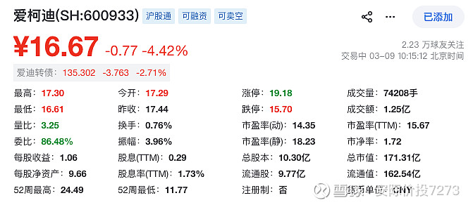 $爱柯迪(SH600933)$ 最近新能源汽车销售同比大幅下降与铝价的大幅上涨让爱柯迪的商业模式与投资逻辑面临双重挤压。让爱柯迪的股价跌跌不休,不知道市值是否会继续下探到 157 亿甚至 141 亿的低估区间。但爱柯迪依旧是一家不错的公司,一家具有竞争力的公司。市场短期的过度反应虽然加剧了风险 ,但也提供了机会。果然,好的公司也要在安全边际高的价格买入,当时在 195 亿左右买入的价格在现在看来安全边际似乎还是给的不够,但依旧还是在可控范围内的。后续继续按照纪律加仓投资,看看最终结果会是如何?耐心等待,慢慢验证。![]()