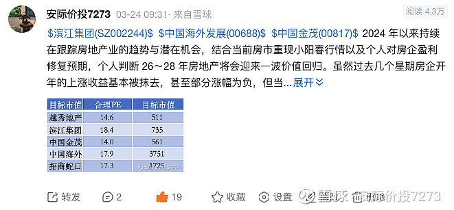 $中国海外发展(00688)$ 今年年报基本是符合我的预期了,难得有一个房企选择不延后结算项目以粉饰下年业绩了。依旧维持中国海外长期归母净利润回到 220 亿水平,长期目标市值 3750 亿元的判断。耐心等待,慢慢验证。(估值各有不同,不提供投资建议)