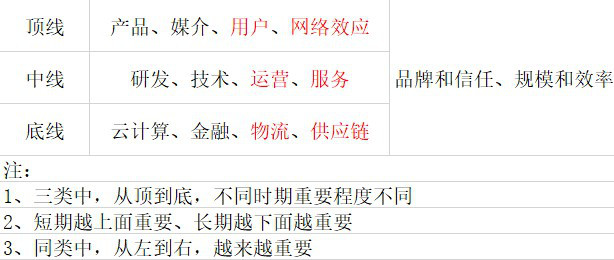 模式可以简单分为平台和自营(细分更多,看《商业模式和电商模式》一文),二者核心逻辑有相同点但有差异:平台是双边网络,平台更多是通过服务商家来服务消费者(反向定制仍然是),网络效应和用户更重要;自营更多是服务消费者来获得和商家的议价权,后者需要有强大的买手团队,规模效应和效率更重要。长期看,综合性平台都会倾向于自营+平台(自营是根基和壁垒,如阿里云,说是平台其实是自营+平台:阿里是阿里云最大的客户,然后将其输出最后联合合作伙伴输出形成生态)。