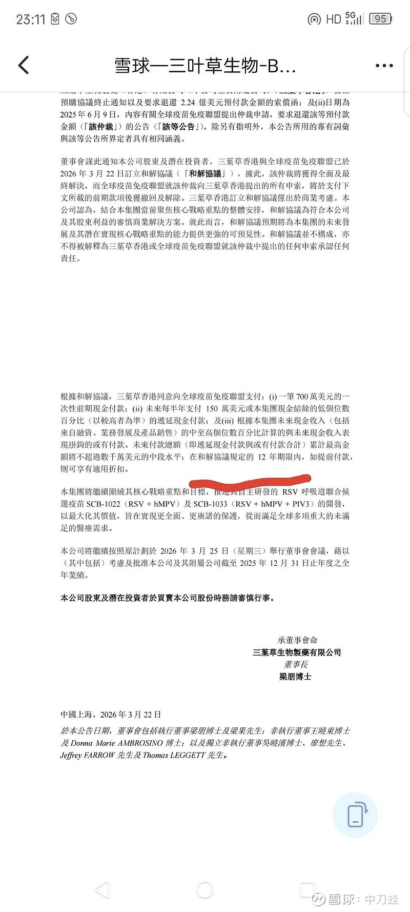 $三叶草生物-B(02197)$ 这个公告信息巨大,首先是不影响开发现金流,第二个隐含的信息是疫苗联盟和小草商议12年,意味着,疫苗联盟认为这个rsv联苗成功概率很高,小草在12年内倒闭的概率挺小。。。。。第三个是为疫苗bd扫清了一个潜在障碍和顾虑。以上是我个人读公告的推测。。。。不代表公司,“三叶草生物-B(02197)”.