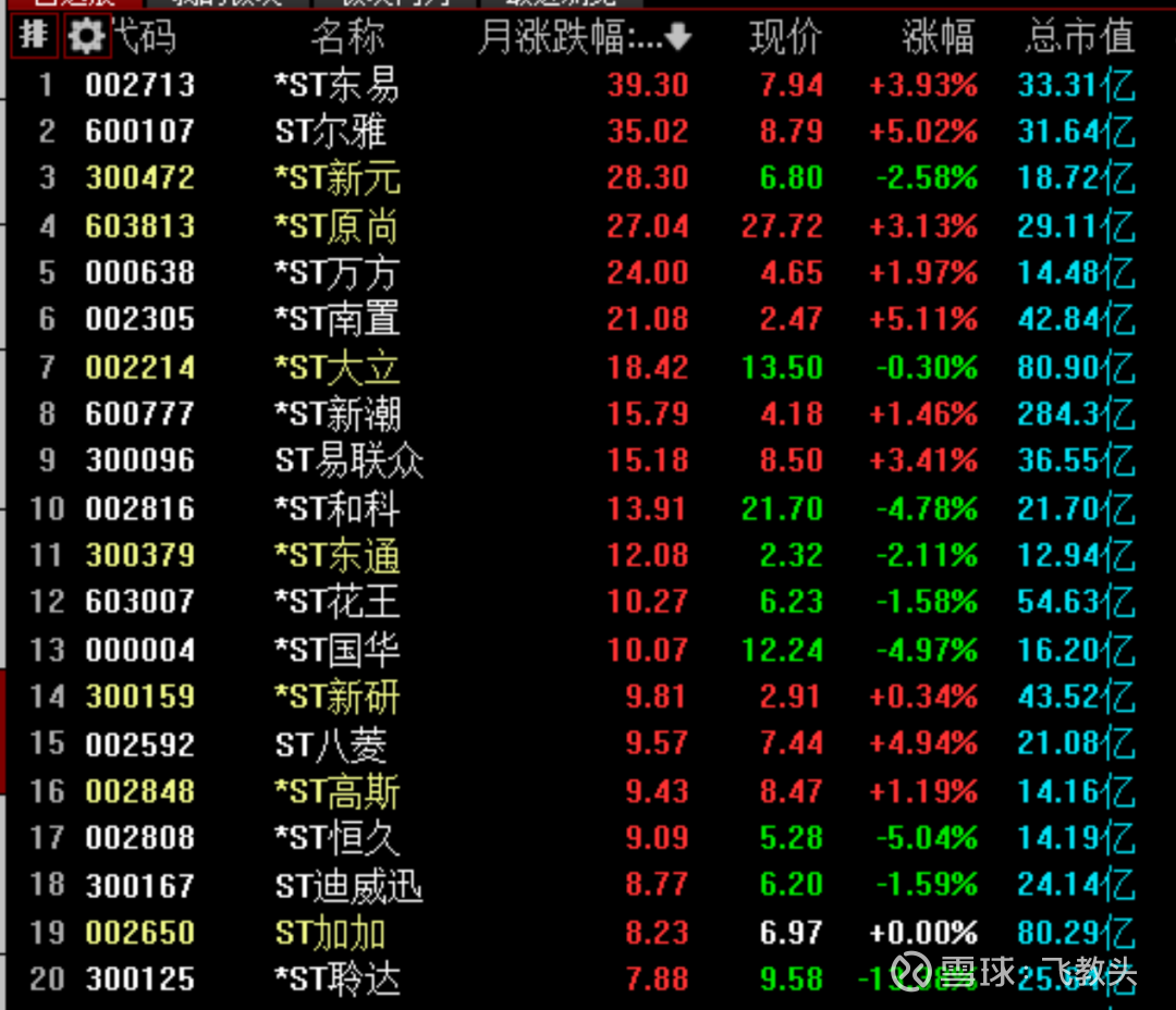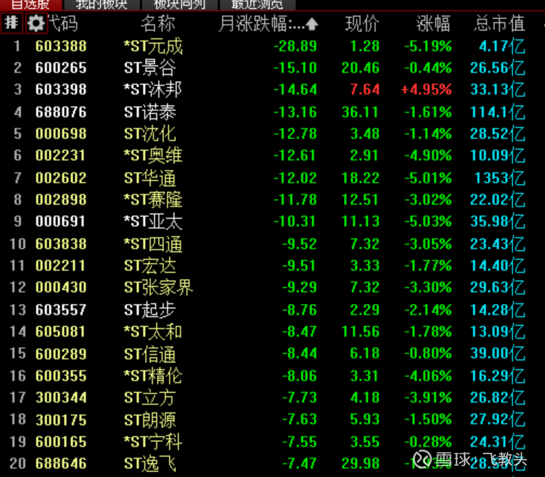 跌幅榜前三的情况,*ST元成退市股:可能面退,走在重大强制违法退市的前面,ST景谷,*ST沐邦,高位回落。