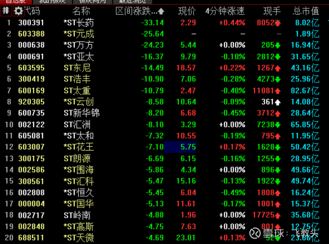 跌幅榜前三的情况,*ST长药-33%(收到立案告知书,出现重大违法退市的提示),*ST元成-25%退市股:触及20天不到5亿市值交易停牌退市,ST万方-24%(立案调查进展风险公告出现重大违法退市的提示),